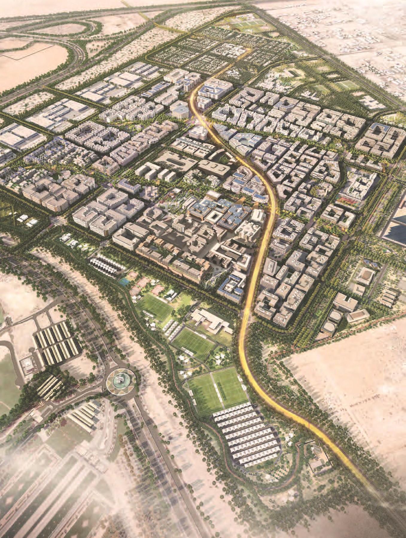 Yes, the project is part of the eco-focused community of Masdar City and features energy-efficient architecture, including cantilevered roof structures, sun-shading facades and low-carbon urban planning.
